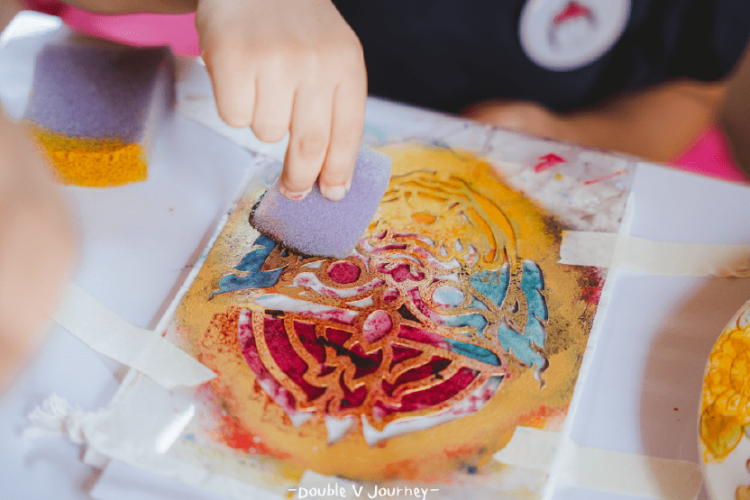 กิจกรรมเสริมสร้างความคิดสร้างสรรค์ โดยการนำฟองน้ำแต้มสีประคบผ่าน